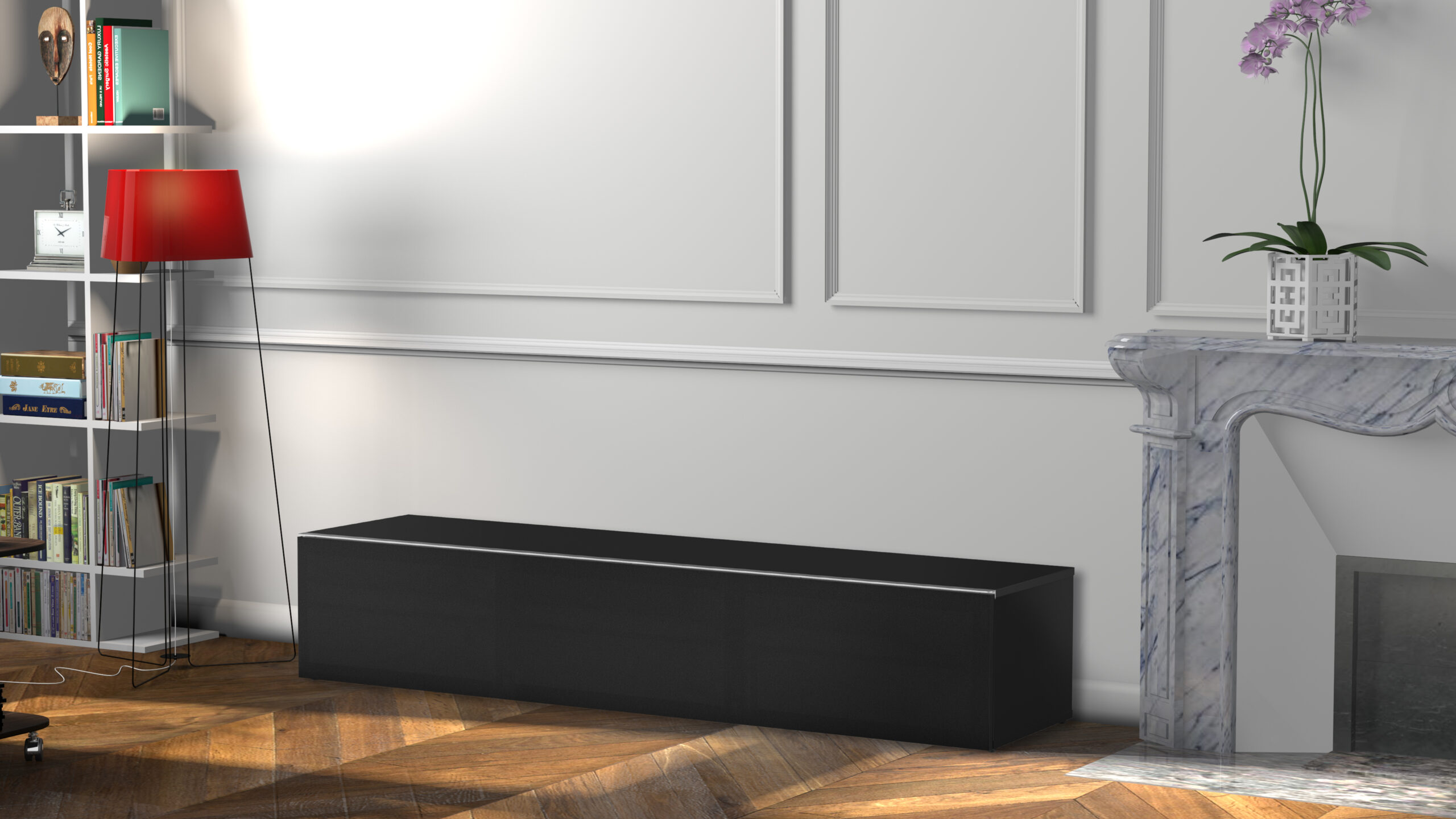 - Caisson en bois mélaminé de couleur noire.