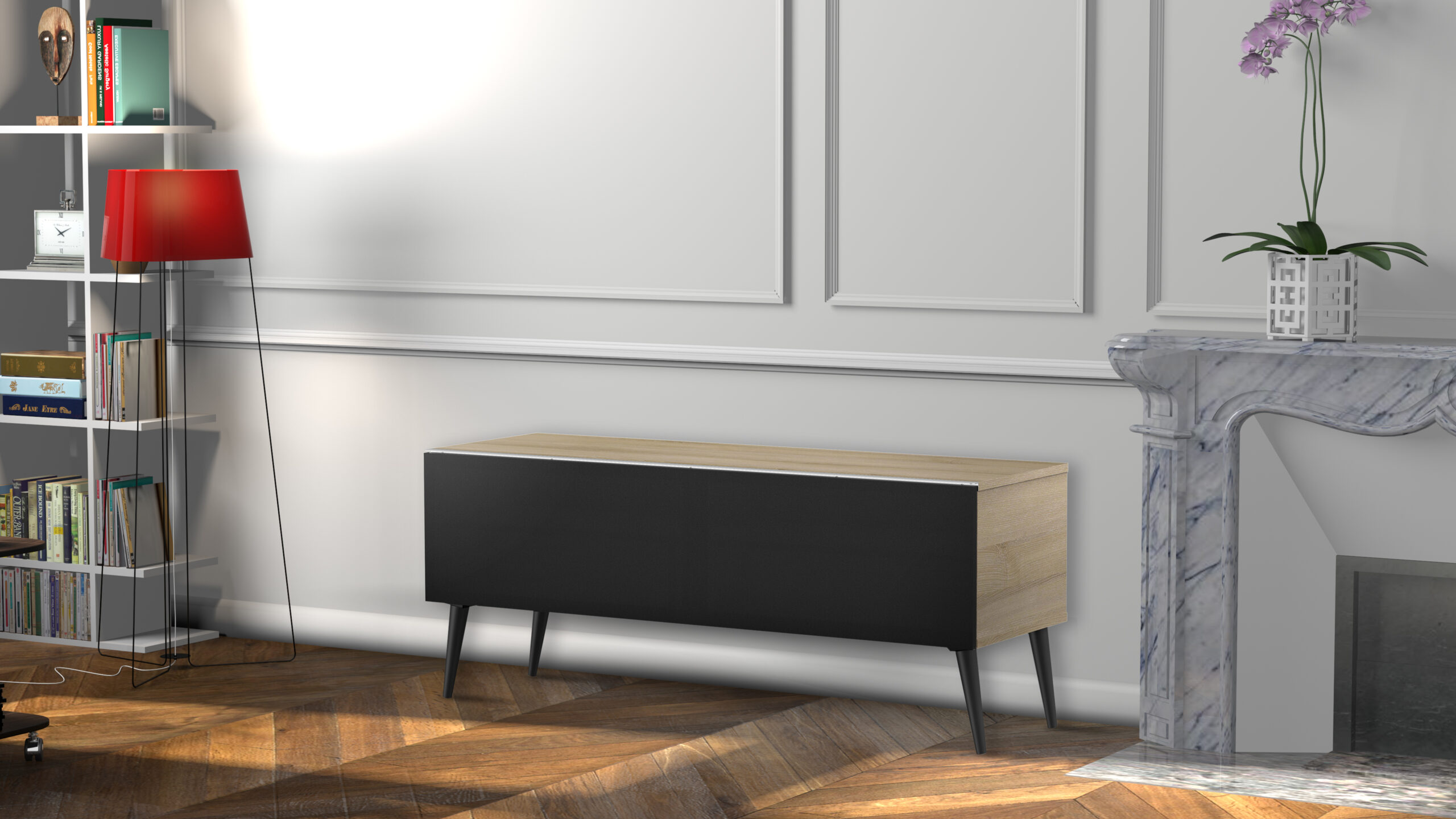- La porte abattante Jet Black 120 de couleur noire, avec ouverture par pression avec aimant poussoir et finition en tissu acoustique & infrarouge, permet de télécommander vos périphériques sans ouvrir la porte du meuble, laissant passer le son et les signaux de vos télécommandes.