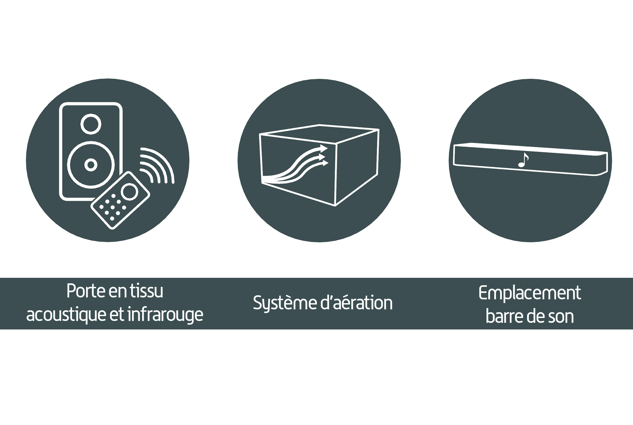 - Porte abattante en tissu acoustique et infrarouge de couleur grise permet de piloter tous vos périphériques audio-vidéo meuble fermé et de laisser passer le son.